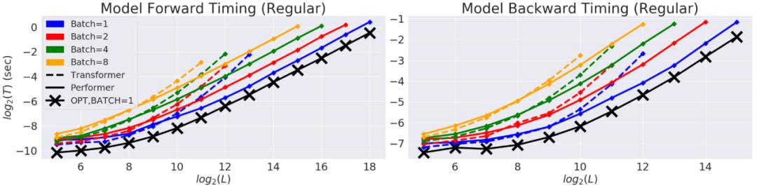 研究者首先对 Performer 的空间和时间复杂度进行基准测试,结果表明,注意力的加速比和内存减少在实证的角度上近乎最优,也就是说,这非常接近在模型中根本不使用注意力机制的情况。