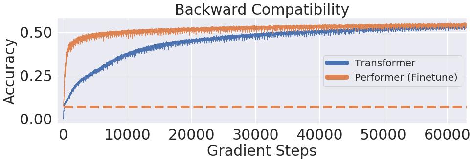 研究者进一步证明,使用无偏 softmax 近似,该 Performer 模型在稍微进行微调之后可以向后兼容预训练 Transformer 模型,从而在提升推理速度的同时降低能耗,并且不需要从头训练预先存在的模型。