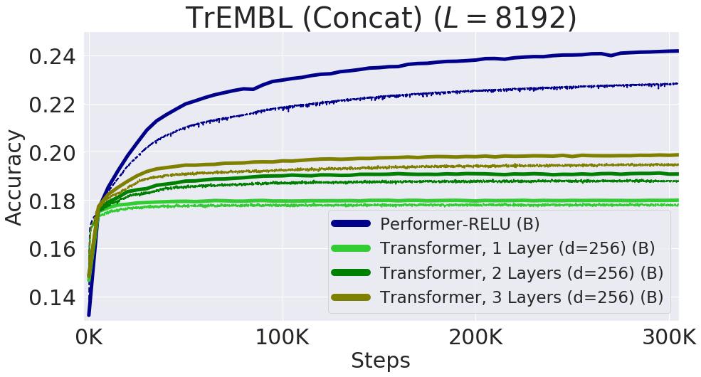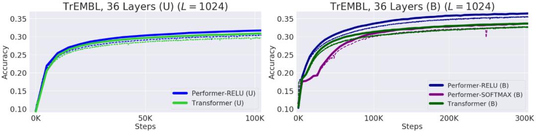 蛋白质具有复杂的 3D 结构,是生命必不可少的拥有特定功能的大分子。和单词一样,蛋白质可以被看做线性序列,每个字符代表一种氨基酸。将 Transformers 应用于大型未标记的蛋白质序列语料库,生成的模型可用于精确预测折叠功能大分子。正如该研究理论结果所预测的那样,Performer-ReLU 在蛋白质序列数据建模方面表现良好,而 Performer-Softmax 与 Transformer 性能相媲美。