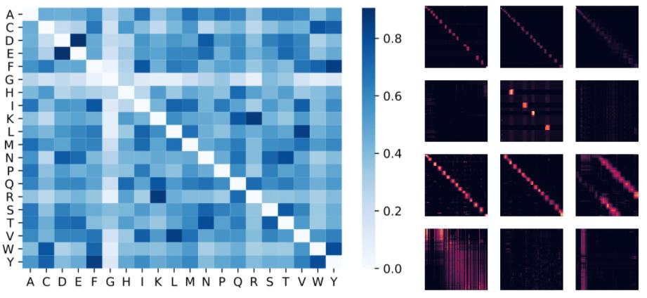 下面可视化一个蛋白质 Performer 模型,该模型使用基于 ReLU 的近似注意力机制进行训练。研究者发现,Performer 的密集注意力近似有可能捕捉到跨多个蛋白质序列的全局相互作用。作为概念的证明,研究者在串联蛋白长序列上训练模型,这使得常规的 Transformer 模型内存过载。但由于具有良好的空间利用效率,Performer 不会出现这一问题。
