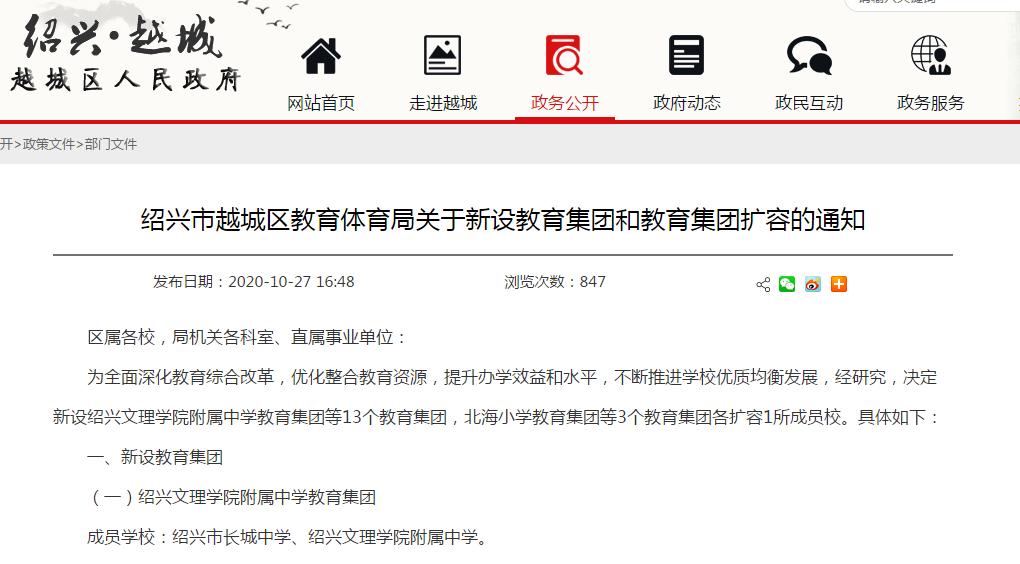 10月27日,越城区人民政府网站公布了一则《绍兴市越城区教育体育局关于新设教育集团和教育集团扩容的通知》。记者发现,越城区将新设绍兴文理学院附属中学教育集团等13个教育集团,北海小学教育集团等3个教育集团各扩容1所成员校。