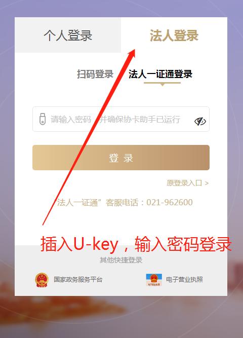 3.2 企业申请人,选择“法人登入”,插入法人一证通,输入密码后登入