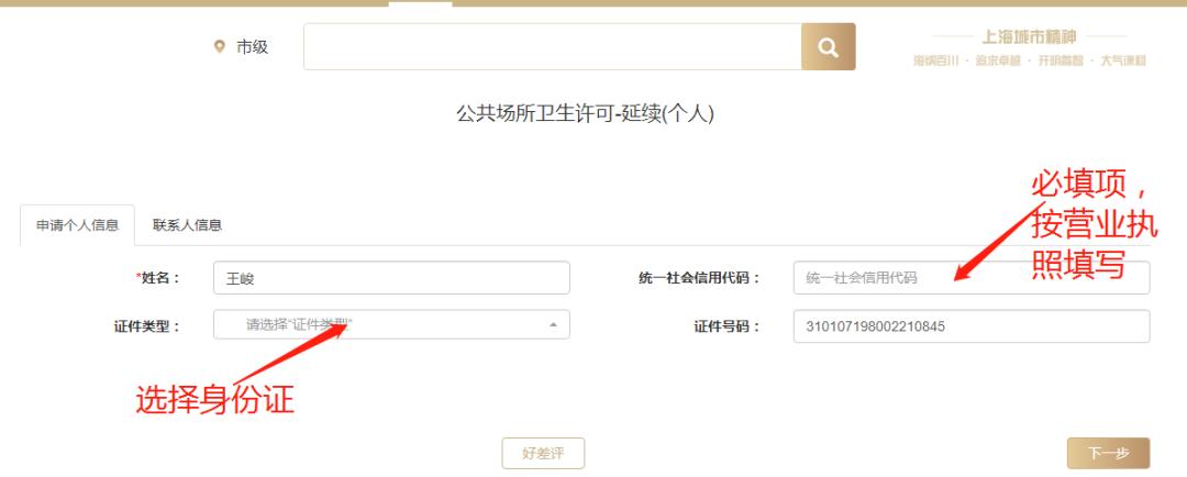 7、申请信息填写7.1个体申请人:按照营业执照上的信息,填写姓名、统一社会信用代码、证件类型、证件号码、联系人信息后,点击“下一步”按钮