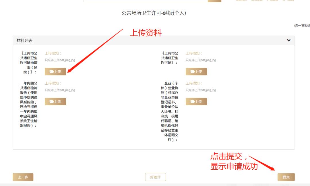 8、根据材料列表,上传所需的材料,点击“提交”按钮。跳转至“申请成功”页面,表明办理成功。