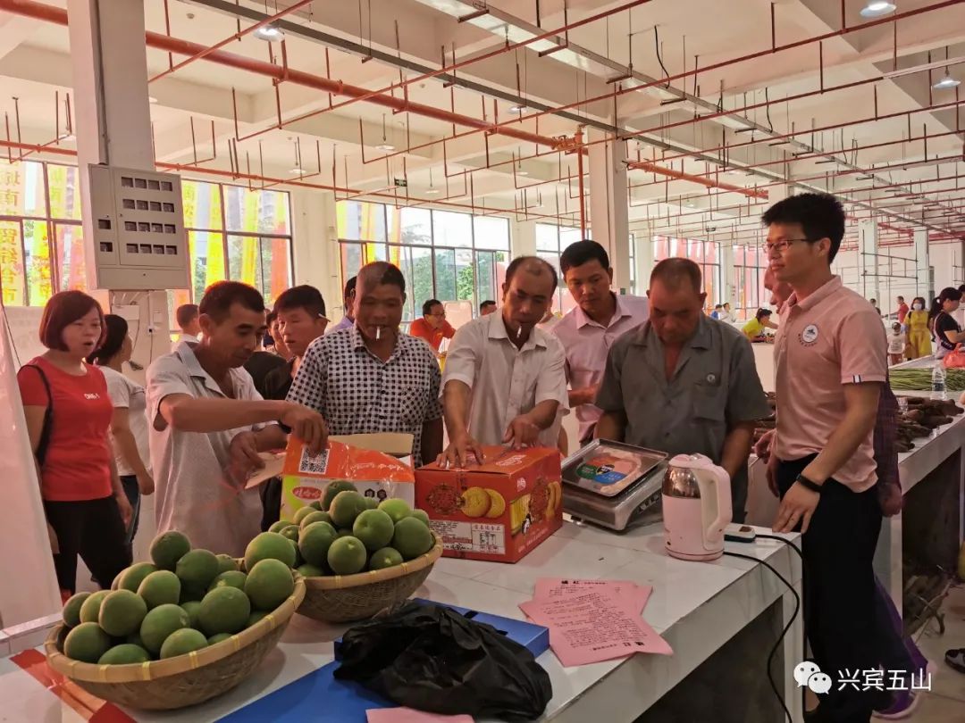 黎子恒(右一)积极引导农户带扶贫产品橘红到兴宾区扶贫产品展销会展销