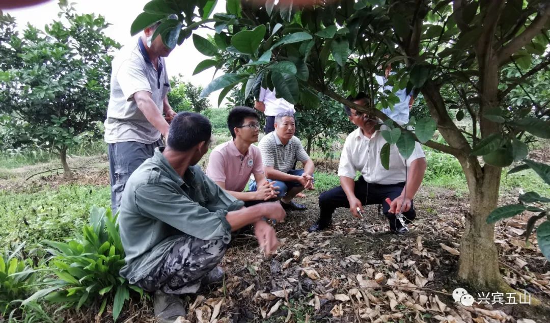 黎子恒(左三)主动联系技术专家到地头为农户种植橘红提供技术指导