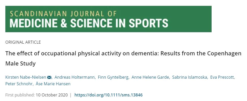 Nabe‐Nielsen, K, Holtermann, A, Gyntelberg, F, et al. The effect of occupational physical activity on dementia: Results from the Copenhagen Male Study. Scand J Med Sci Sport. 2020; 00: 1– 10. https://doi.org/10.1111/sms.13846