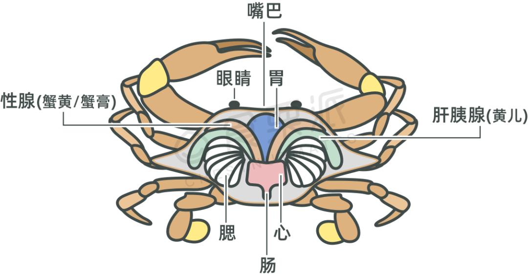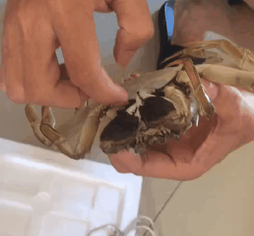 再看蟹壳。蟹壳前半部、眼睛下方的三角形部位,就是蟹胃。蟹胃里面有很多脏东西,比如未消化完成的死鱼。
