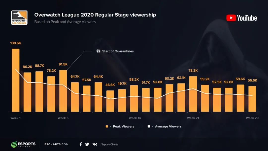 也许是因为Twitch到YouTube的平台转换,也许是因为赛制改变,我们很难简单将守望先锋联赛在国外收视的下降归纳到一个简单的原因。但是,在今年疫情扩散后,传统体育停摆,电竞联赛收视普遍攀升的情况下,守望先锋联赛常规赛则在年中出现了下滑的倾向,表明国外观众对联赛的兴趣确实有所下降。