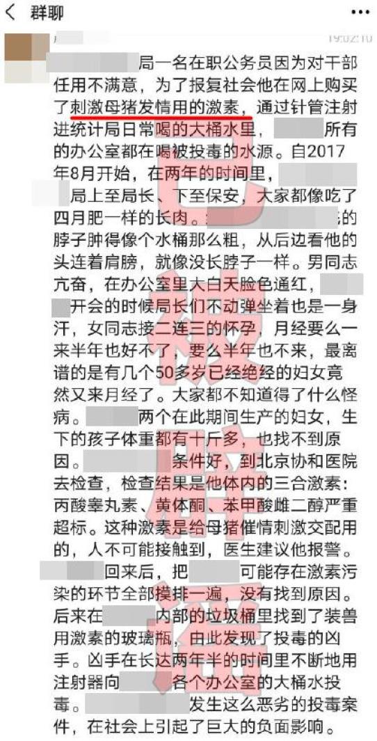 “山东省乳山市统计局一名在职公务员因对干部任用不满意,网购刺激母猪发情用的激素,自2017年8月开始,通过针管注射进同事日常喝的大桶水里,致统计局多人健康受影响。”