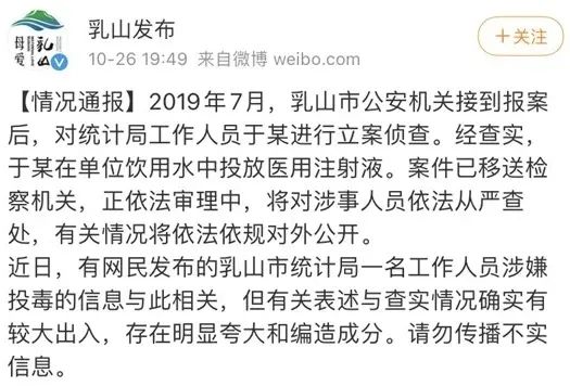 那么,是否真有其事呢?10月26日晚,乳山市政府新闻办发布消息称,已对涉事人员于某立案侦查,查实投放的是医用注射液。近日,有网民发布的乳山市统计局一名工作人员涉嫌投毒的信息与此相关,但有关表述与查实情况确实有较大出入,存在明显夸大和编造成分。请勿传播不实信息。