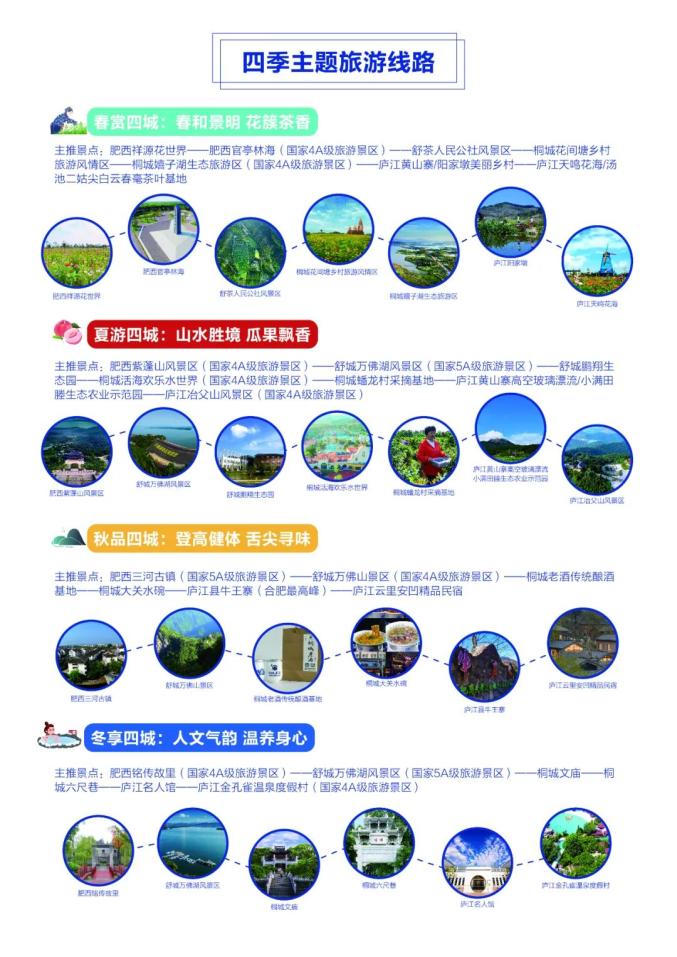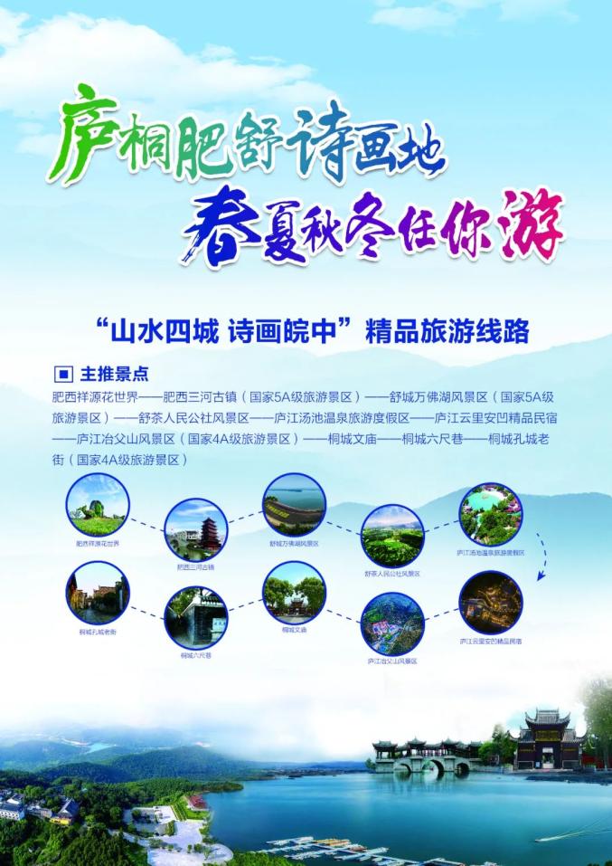 主推景点:肥西祥源花世界——肥西三河古镇——舒城万佛湖风景区——舒茶人民公社风景区——庐江汤池温泉旅游度假区——庐江云里安凹精品民宿——庐江冶父山风景区——桐城文庙-六尺巷——桐城孔城老街