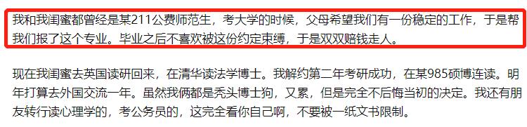 而即使是公费师范生,也可以通过转专业或赔付违约金的方式解除服务合同,另寻出路。解除服务合同并不会影响之后的就业和工作。知乎上有不少公费师范生解约的相关回答,许多答主已经成功考公,或进入企业工作。