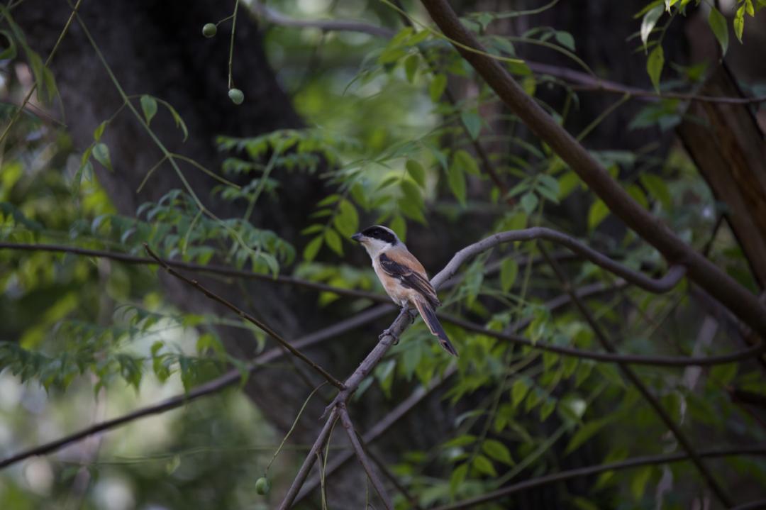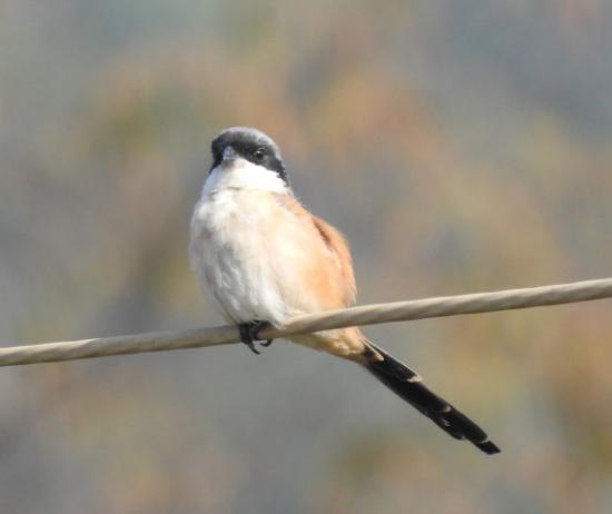大概有两个麻雀大,在雀形目中体型不小。标配是伯劳家族标志性的“佐罗眼罩”,弯弯的尖嘴,暖棕色的背部,还有长长的尾巴,所以英文名叫做long-tailed shrike(长尾伯劳)。