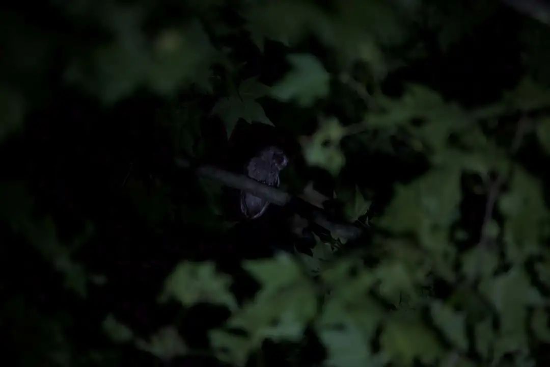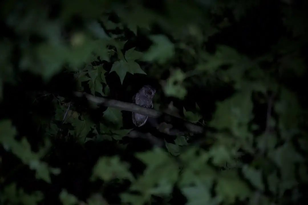 一个夏末的午夜,笔者在阳台上收拾晾晒的衣服时,听见窗口外传来清晰的叫声,遂返回卧室拿出手电,一番搜索,看见血红的一双眼睛注视着我——一只领角鸮仅离我有三米远的位置!这也是笔者观察猫头鹰中最近的一次,虽然在拿相机出来时它已飞跑,但这一次邂逅也在我的内心留下了浓墨重彩一笔。