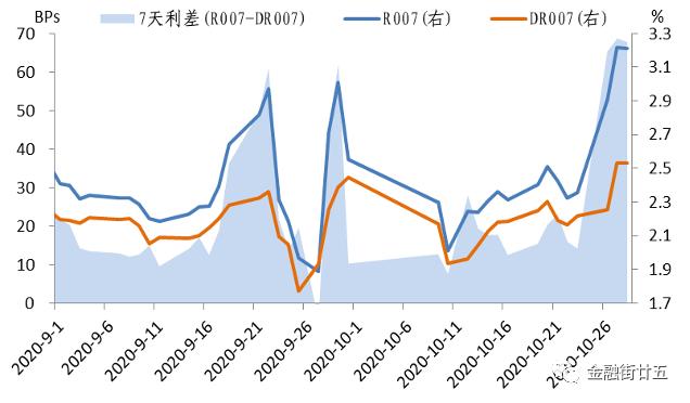 10月,银行间隔夜回购利率中枢较9月上行35BPs至2.10%,7天回购利率R007中枢上行8BPs至2.48%;存款类机构的隔夜回购利率中枢较9月上行34BPs至2.01%,7天回购利率R007中枢上行3BPs至2.20%。