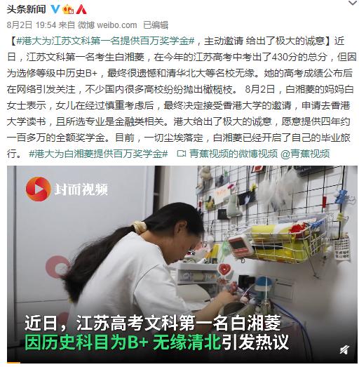今年江苏考生白湘菱以430分拿下省内文科第一,由于选考的历史等级为B+,她被想报考的北大、清华、南大拒绝。白湘菱最终选择了为其提供百万奖学金的港大。