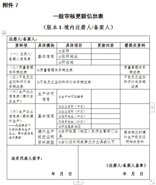 一般审核更新时,应当提交一般审核更新信息表(附件7),同时一并提交符合要求的相关资料。其中,境外注册人、备案人名称发生变化的,应当提供由所在国(地区)政府主管部门或者有关机构出具的主体未发生变化的相关证明文件原件,无法提交原件的,应当提供由中国公证机关公证的复印件。