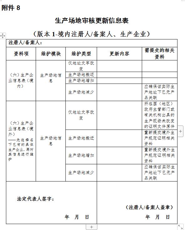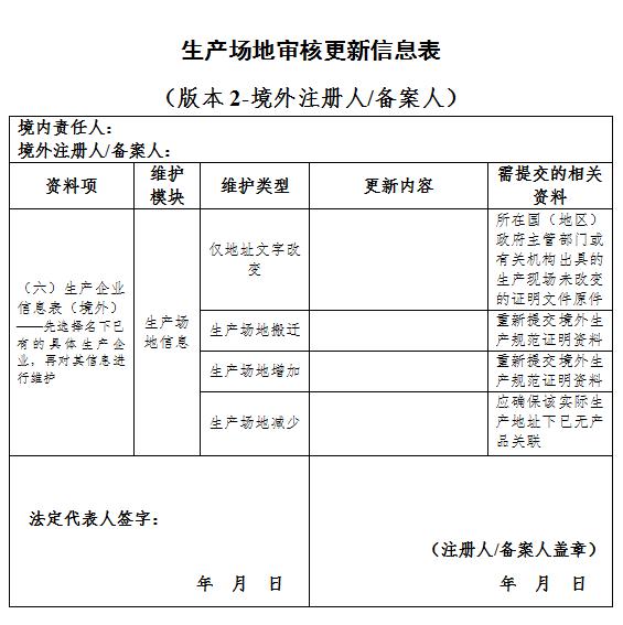 进行生产场地审核更新时,应当提交生产场地审核更新信息表(附件8),同时一并提交符合要求的相关资料。其中,境外生产企业生产场地仅地址文字改变的,应提供由所在国(地区)政府主管部门或者有关机构出具的生产现场未改变的证明文件原件,无法提交原件的,应提供由中国公证机关公证的复印件;生产场地搬迁或者增加的,应按要求重新提供境外生产规范证明资料。