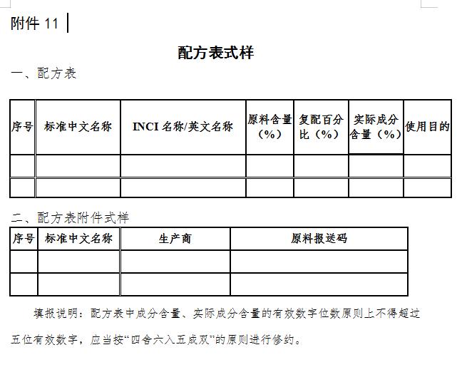(一)配方表要求。产品配方表应当包括原料序号、原料名称、百分含量、使用目的等内容(附件11)。