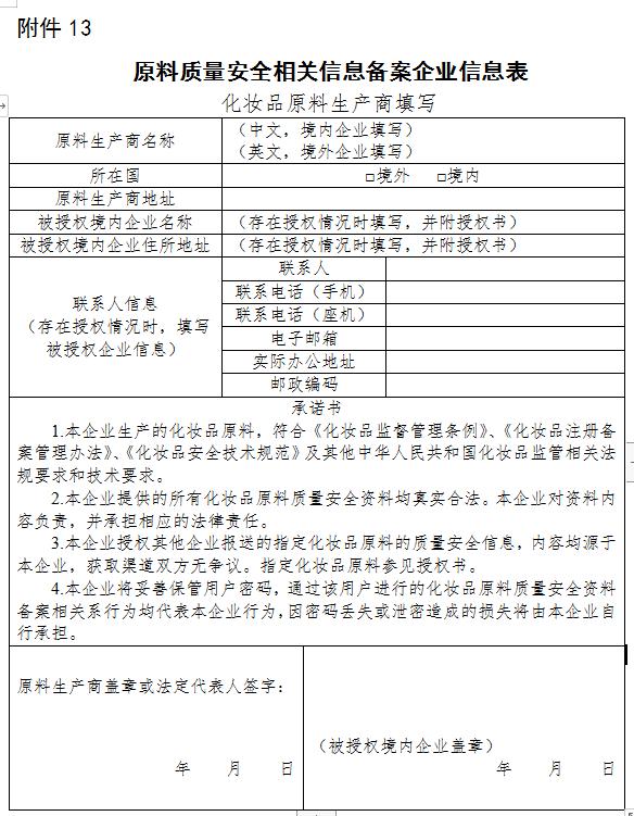 (二)(原料安全相关信息)注册人、备案人或者境内责任人应当填写产品所使用原料的生产商信息并上传由原料生产商出具的原料质量安全信息文件。原料生产商已根据《化妆品原料质量安全相关信息报送指南》(附件12以及附件13)报送原料质量安全相关信息的,注册人、备案人或者境内责任人可填写原料报送码(附件14)关联原料质量安全信息文件。