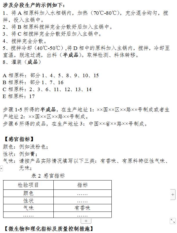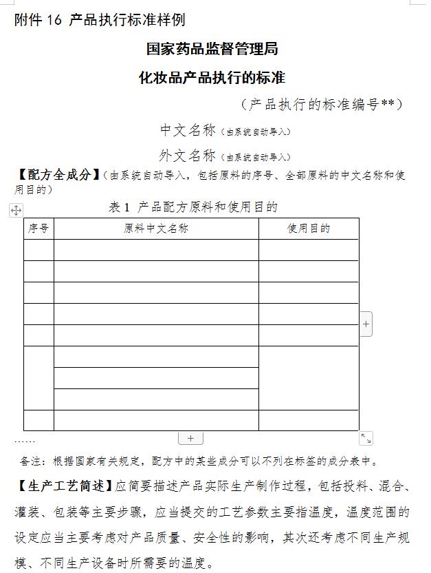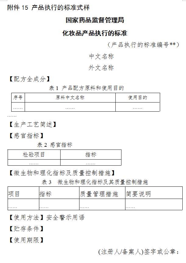 第二十八条(产品执行的标准)产品执行的标准包括产品名称、配方全成分、生产工艺简述、感官指标、微生物和理化指标及其质量控制措施、使用方法、贮存条件、使用期限等内容,应当符合国家有关法律法规、标准规范的规定(式样及编制说明见附件15,样例见附件16)。
