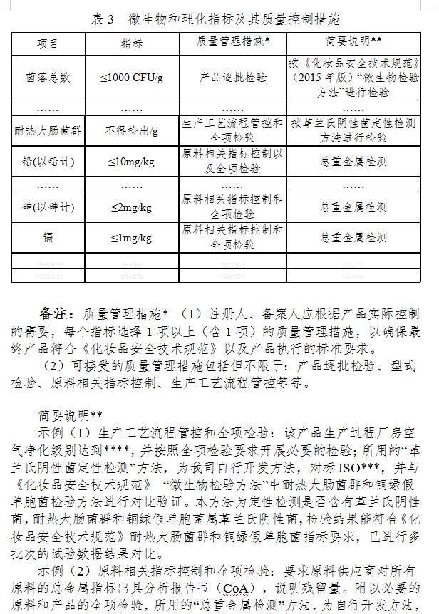 1. 应当提交对产品实际控制的微生物和理化指标,微生物和理化指标应当符合《化妆品安全技术规范》和《化妆品注册和备案检验工作规范》的要求。