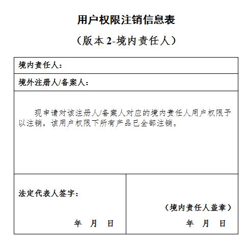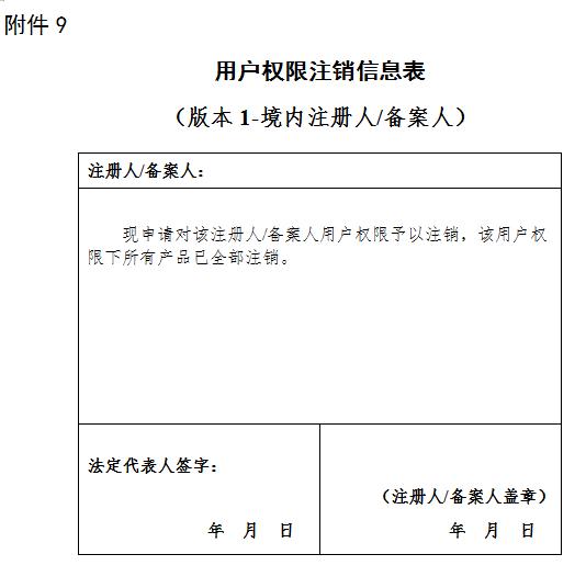 第二十三条(用户权限注销)根据实际生产经营情况,需对用户权限进行注销的,应当在相关产品全部完成注销后,提交用户权限注销信息表(附件9),进行用户权限注销。用户权限注销后,将无法办理新增的注册或者备案事项。
