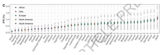 研究人员估算了感染死亡率(infection-to-fatality,IFR),即感染病毒的人中可能因此而死亡的比例。在不同国家/地区, 5-9岁年龄段因感染新冠而死亡的比例始终是最低的。年龄每增加5岁,感染死亡率增加0.59%。
