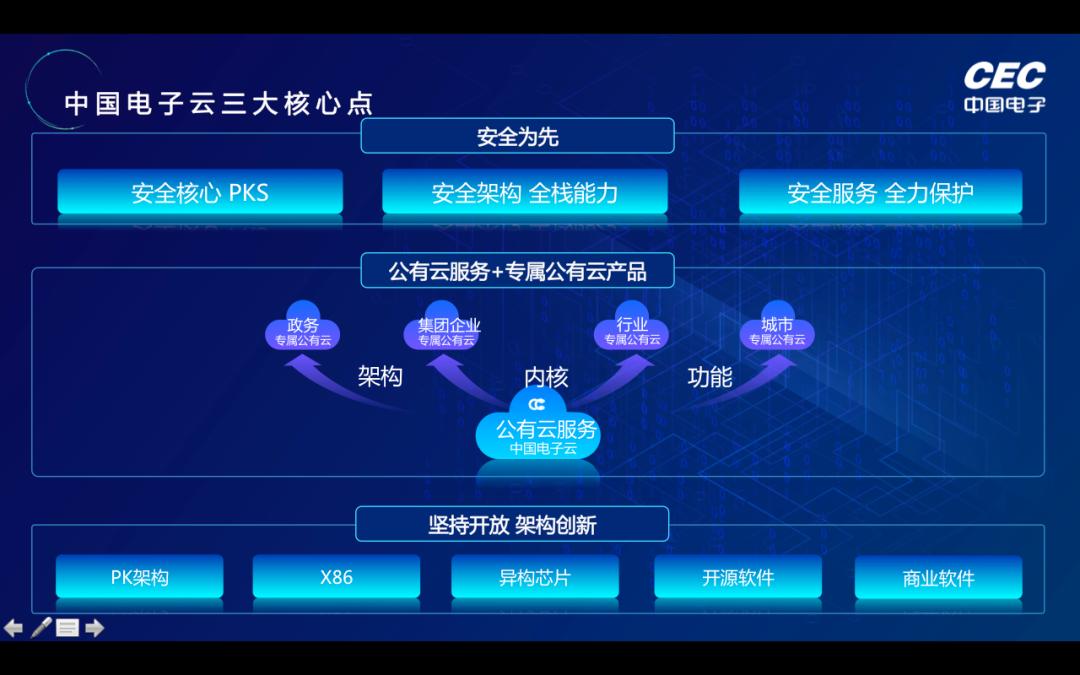 中国电子云采用了被誉为“中国架构”的“PK”体系,并加入“S-Security”立体防护的安全可信链,筑牢自主核心安全技术的基础和底座,为政企客户数字化转型升级提供安全有力的心脏。作为专属公有云,中国电子云具备IaaS、PaaS和SaaS全栈能力,依托中国电子领先的网信产业和技术能力,构建开放、创新、协作的商业模式和生态体系,极致产品化部署,为客户提供安全可信、持续进化、自主运营、智能运维的云边端全场景解决方案。