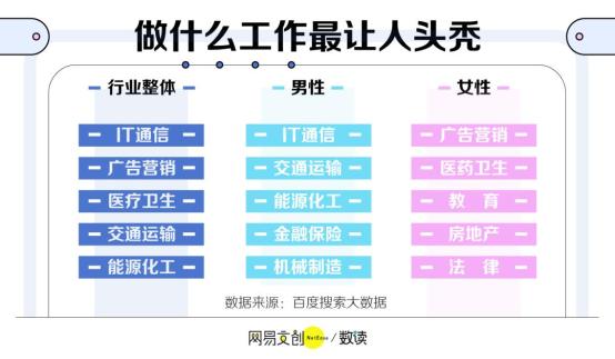 IT 通信行业不出意外地成为男性秃头的“重灾区”,对于女生来说最容易头秃的行业是广告营销和医药卫生。她们为工作付出的不止是青春,还有飘逸的长发。