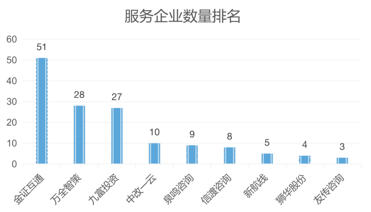 据电鳗财经统计,共有29家财经公关为上述企业提供服务,服务企业数量综合排名前三甲的财经公关分别为金证、万全、九富,其市场占有率分别为31.5%、14%、13.5%,三家合计市场占有率达59%。服务企业数量排名前九位的分别为金证互通、万全智策、九富投资、中改一云、泉鸣咨询、信渡咨询、新航线、狮华股份、友传咨询,服务企业数量分别为51家、28家、27家、10家、9家、8家、5家、4家、3家。