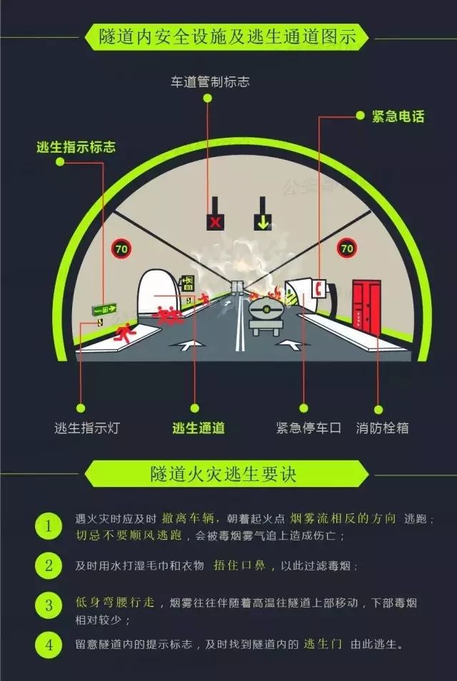 提示:不同季节,隧道外可能出现雨、雪、雾等情况,应减慢车速,防止积水、结冰等引起车辆侧滑。如果隧道内发生火灾了该怎么办?