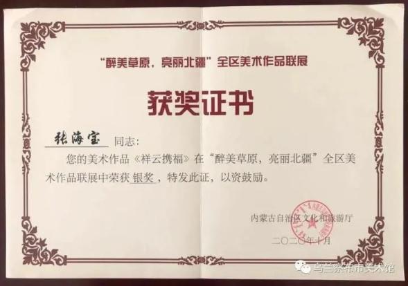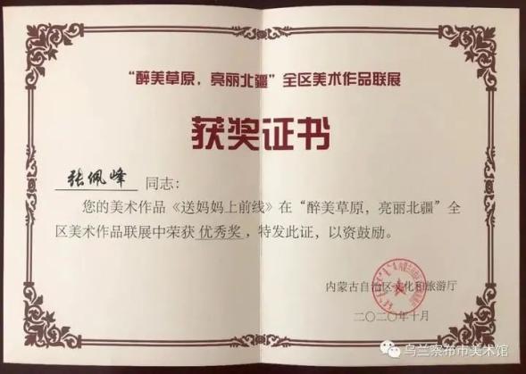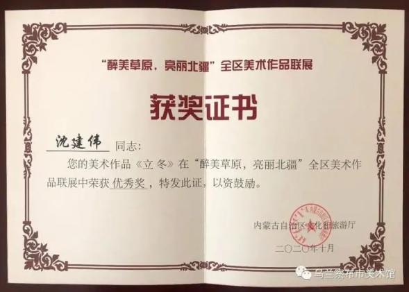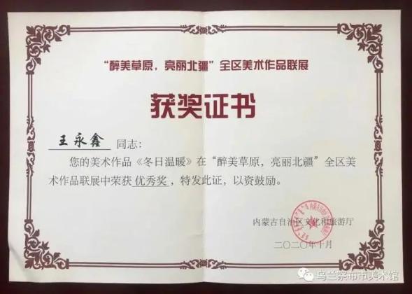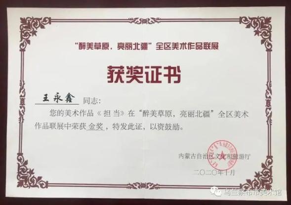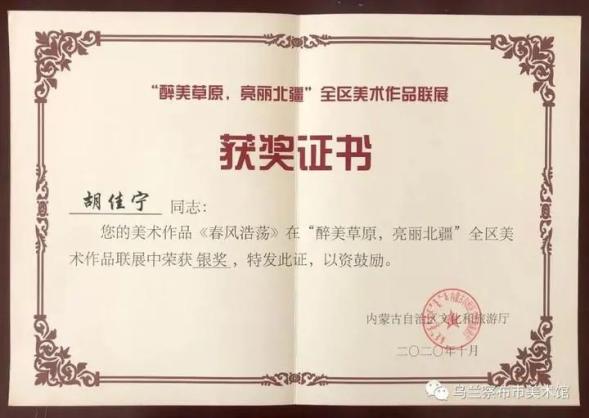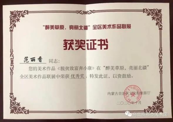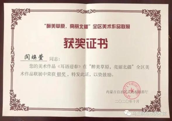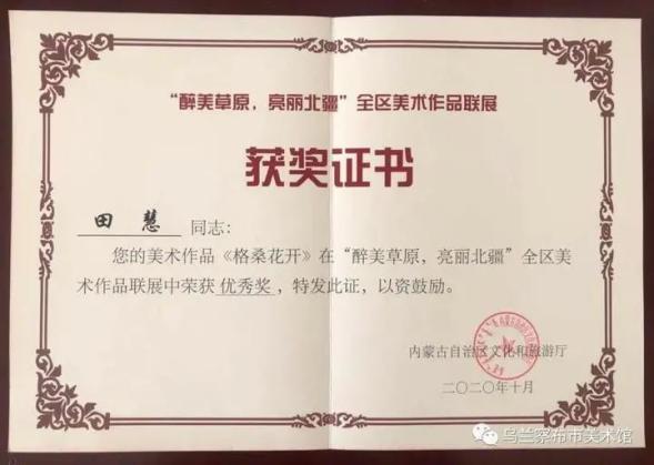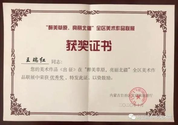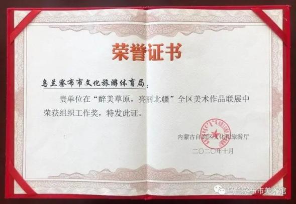 在内蒙古自治区文化和旅游厅举办的“醉美草原 亮丽北疆” 全区美术作品联展中,由乌兰察布市书画院(美术馆)组织的10幅美术作品全部获奖,此次展览共设置金奖三个、银奖六个,铜奖9个,部分优秀奖。我市金奖作品1个,银奖作品3个,优秀奖作品6个。内蒙古自治区文化和旅游厅授予乌兰察布市文化旅游体育局组织工作奖。
