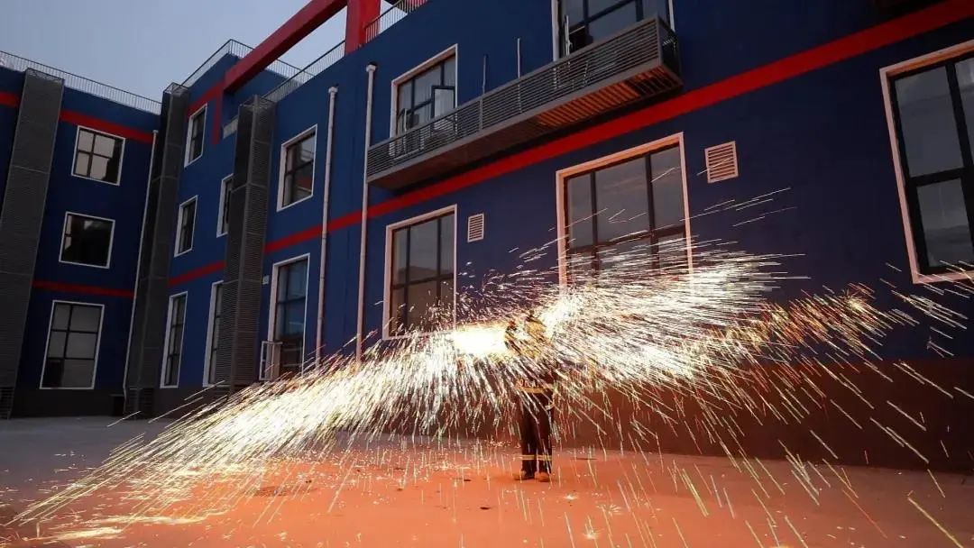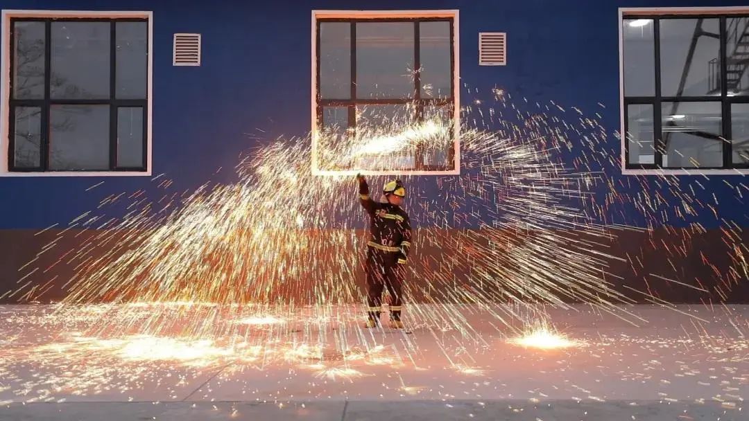 消防员首先逐一点燃钢丝棉,再开启小风扇,随着扇叶的转动,钢丝棉上的焰火不断向外溅出,大家都被这美丽的一幕所吸引。