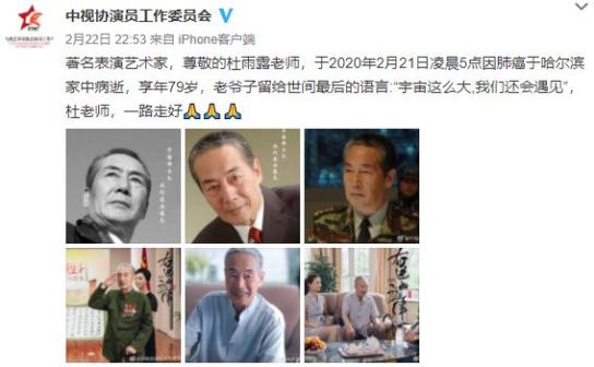 今年2月21,国家一级演员杜雨露因肺癌于哈尔滨家中病逝,享年79岁。