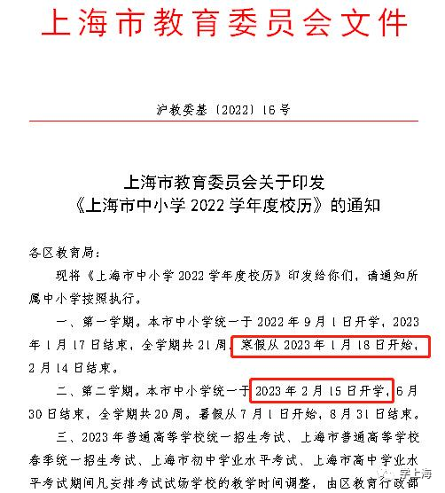 上海寒假时间定了!