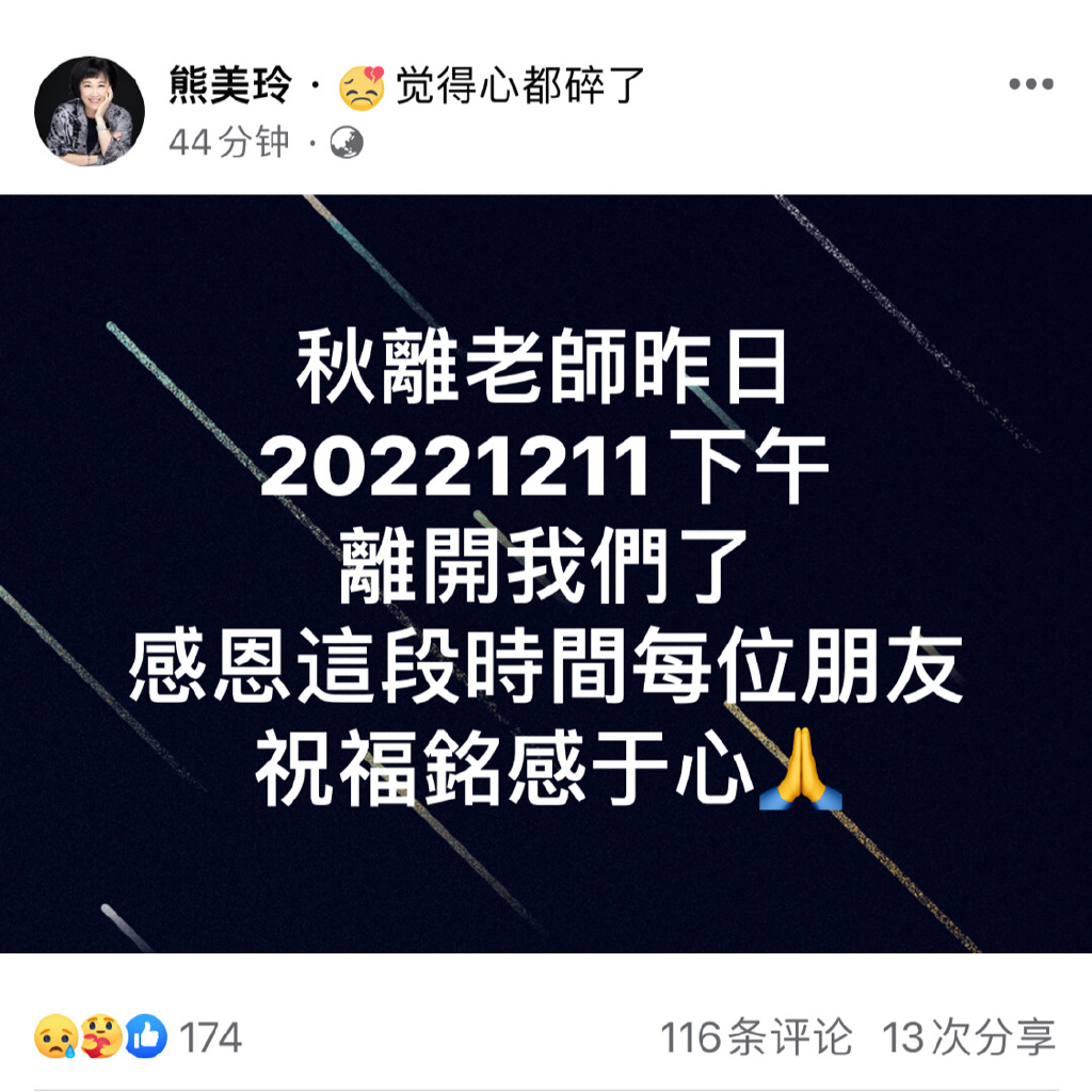 林秋离太太熊美玲发文正式宣布其夫死讯