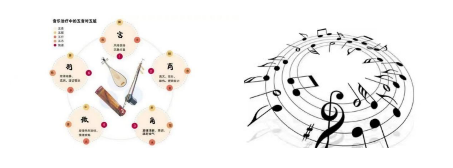 中医五音疗法理论基础是基于中医五行学说中的相生相克关系。《黄帝内经》中载有“天有五音:角徵宫商羽;地有五行:木火土金水;人有五脏:肝心脾肺肾”,是将5种音阶与人体五脏以及五志等关联起来。“诸痛痒疮,皆属于心” ,而五音中“徵为心之音,和而美也。”徵调式的音乐通于五脏之君主——心,能促进全身气机的提升,调节心脏功能,兼有助脾胃、利肺气、泻肝火的作用。因此身体的多种疼痛,选择徵调式的音乐来缓解最合适。