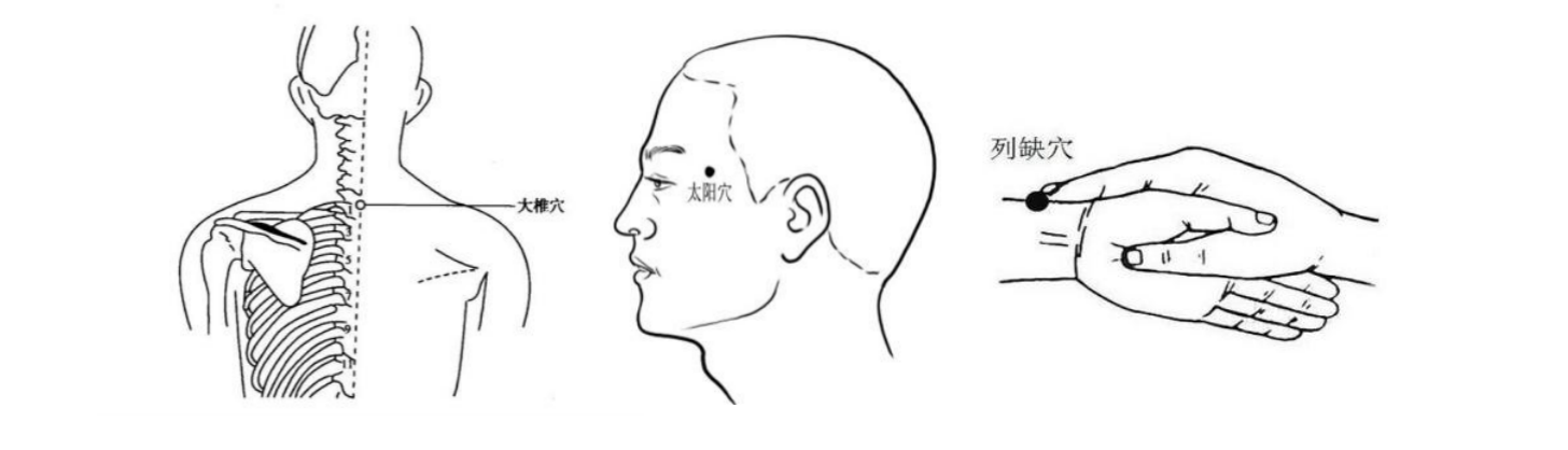 大椎穴:为手足三阳及督脉之会,循督脉上传头颈,既能温通阳气,散寒解表,也可疏风清热,临床用于治疗外感头痛。取穴方法:正坐低头,该穴位于人体的颈部下端,第七颈椎棘突下凹陷处,约与肩平齐。