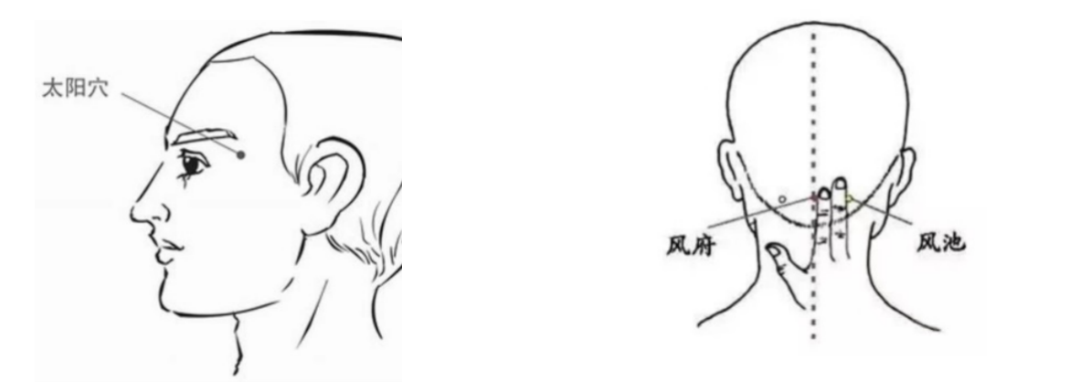 指压太阳、按揉太阳太阳穴,在颞部,当眉梢与目外眦之间,向后约一横指的凹陷处。用双手拇指同时在双侧太阳穴下压,指压10次后,在太阳穴行按揉法,2分钟。