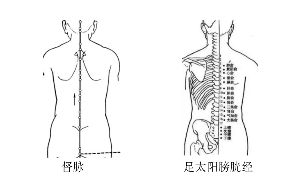 取督脉、膀胱经之循行于胸腰背部一段。擦督脉、膀胱经以扶住阳气,散寒化湿。用掌擦法上下往返操作。先擦督脉,再擦督脉两侧之膀胱经。共约3-4分钟。