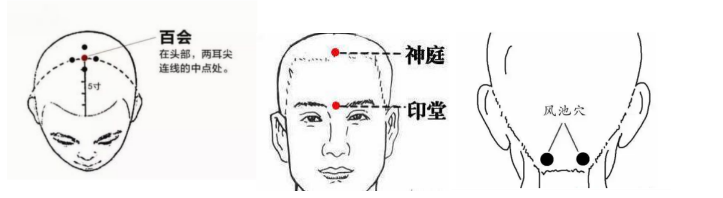 百会穴:二耳尖的连线的中点,头顶的前正中线上,选用角刮法3~5分钟。