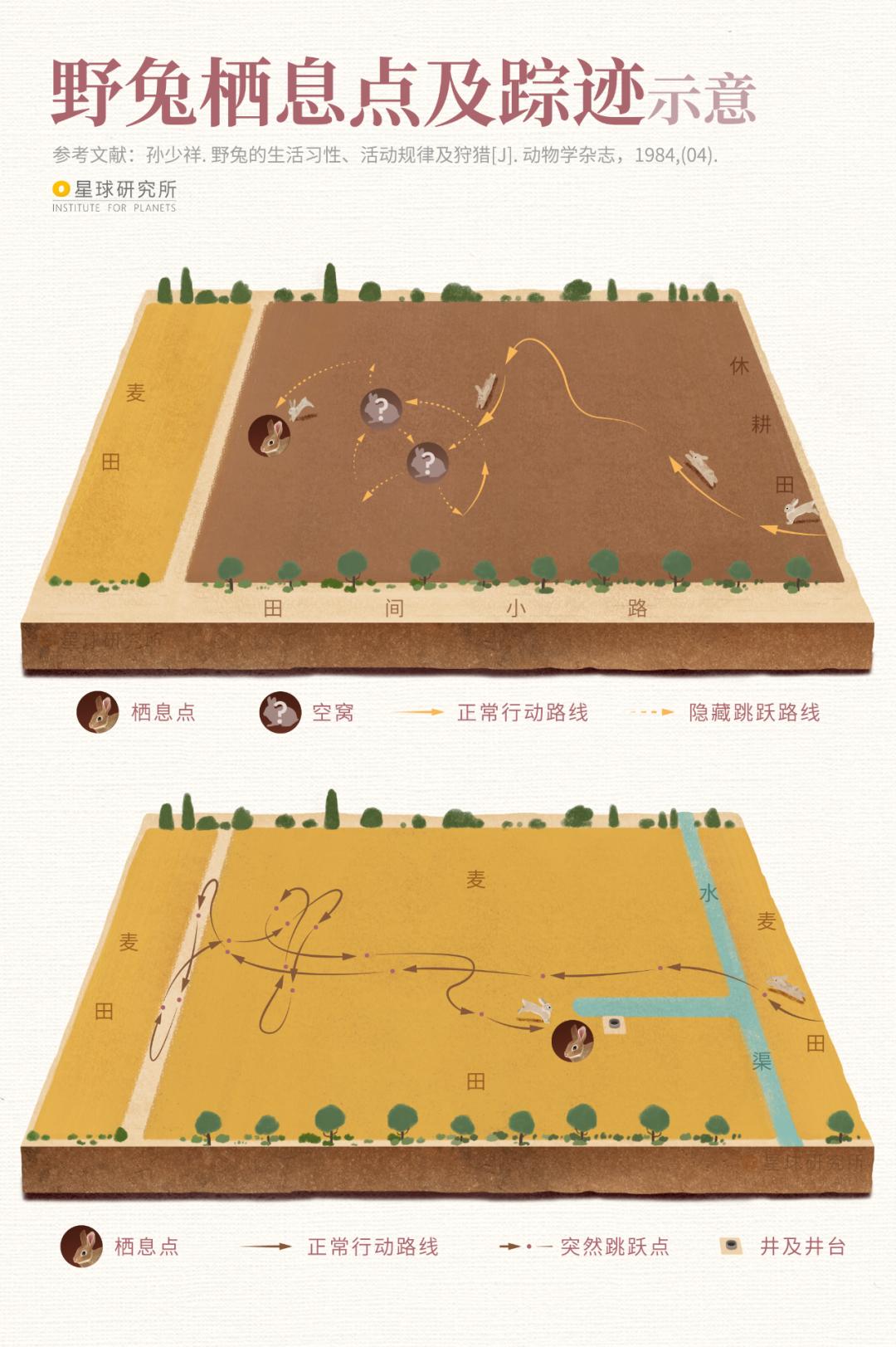 (野兔栖息点及踪迹示意图,野兔通常有多个隐藏点,当接近隐藏点时,会使用特殊的跳跃方式,足迹、方向和跳跃距离都与正常情况大不相同,制图@汉青/星球研究所)