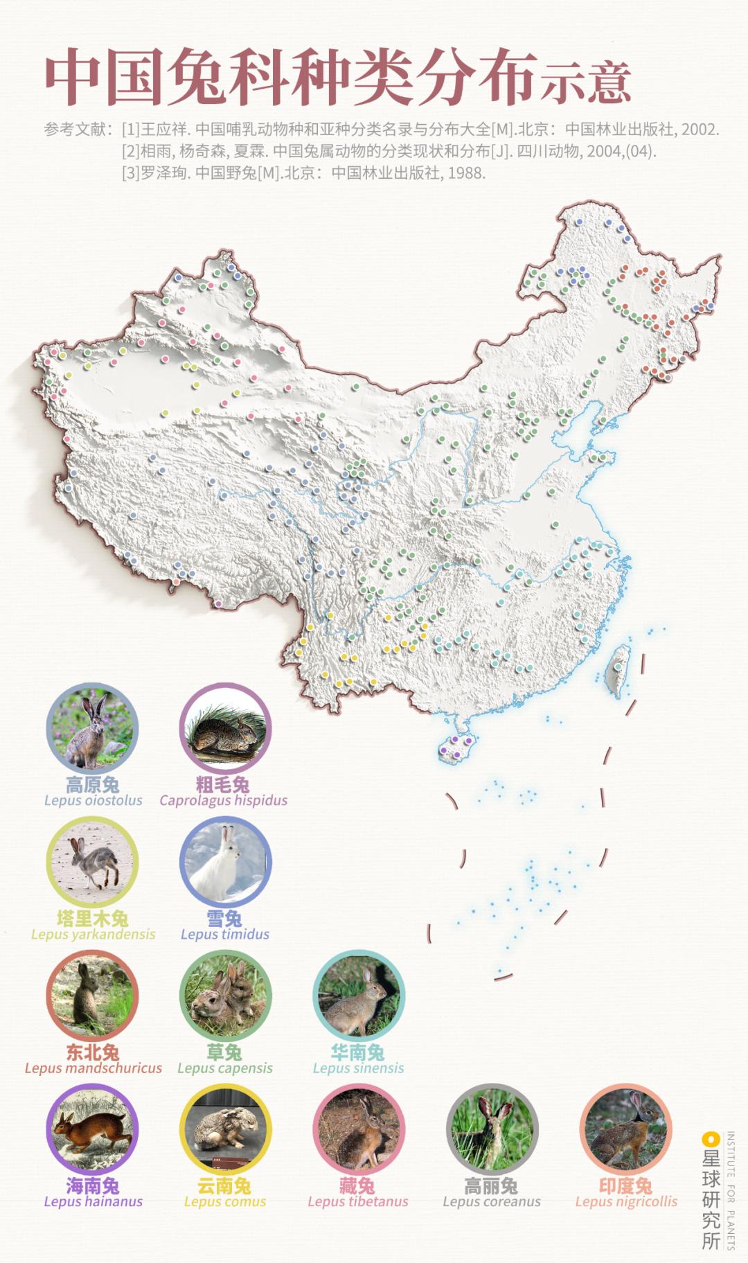 (中国兔科种类分布示意,中国境内现存野生兔类两属,兔属11种,粗毛兔属1种,摄影师@邹滔、敖咏梅、王聿凡、视觉中国、wikimedia commons,制图@松楠/星球研究所)
