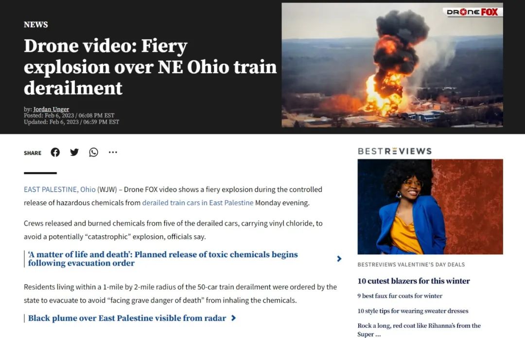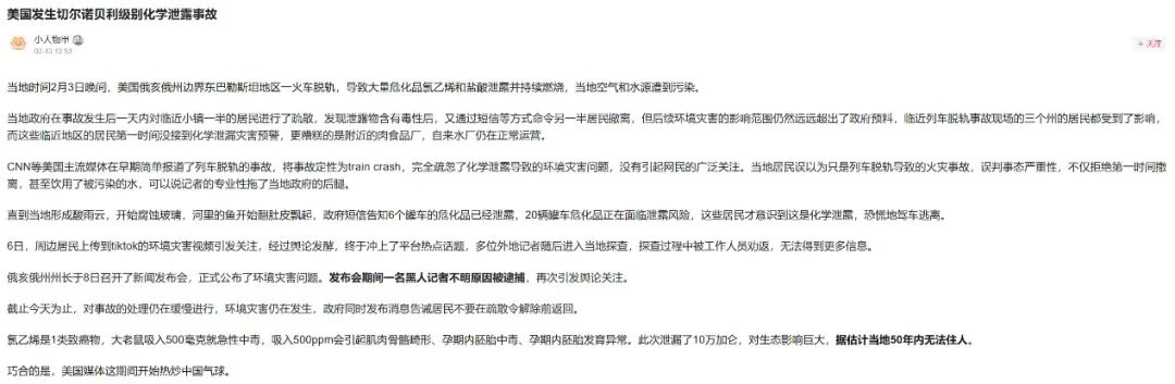 明查|美国俄亥俄州列车脱轨引发泄漏达到“切尔诺贝利级”?