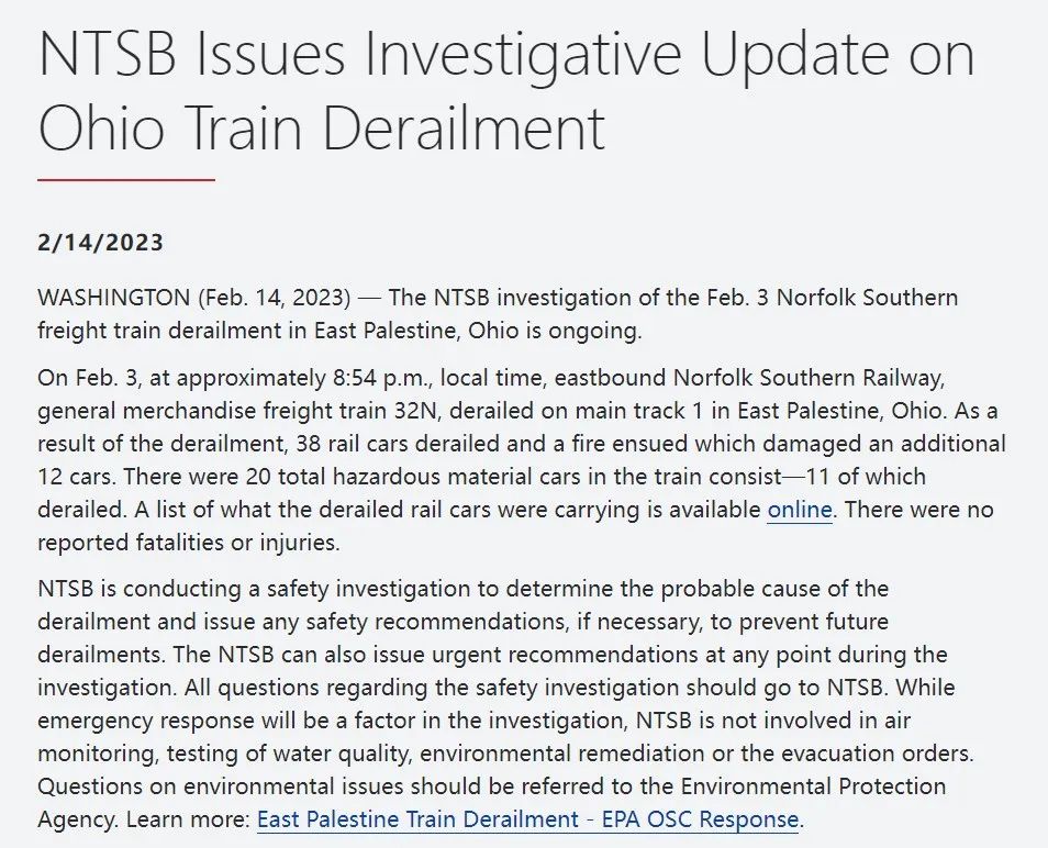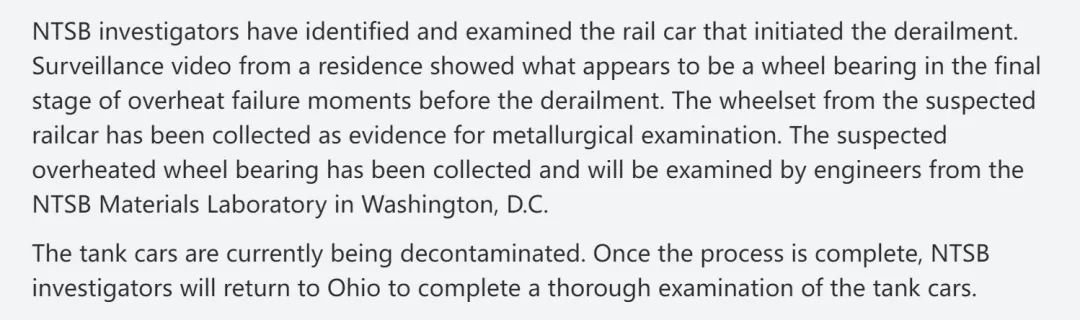 NTSB 2月14日的最新调查报告指出,居民家的监控显示,列车在脱轨前的最后阶段,一个车轮轴承似乎出现过热故障。疑似过热的车轮轴承已被收集,并将由工程师进行检查。NTSB还表示,初步报告预计将在两周内发布。
