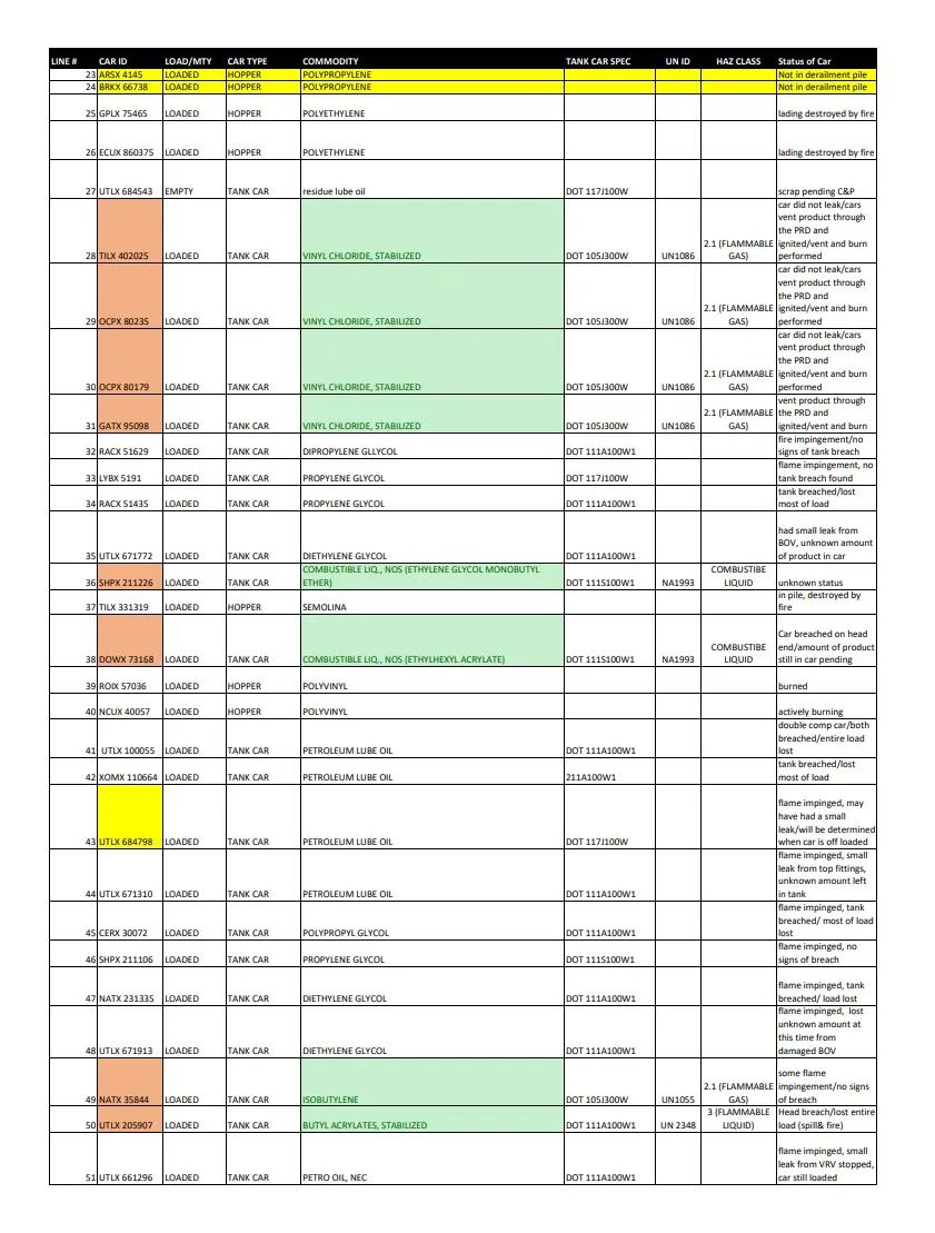 一份美国环保署公布的文件披露了有关32N的脱轨车厢的细节,显示这些车厢内载有氯乙烯、聚乙烯、聚丙烯、残渣润滑油、石油润滑油、二甘醇、二丙二醇、丙二醇、可燃液体NOS、异丁烯、丙烯酸丁酯、石化油、聚丙二醇、苯、燃料添加剂、石蜡等多种化工用料,其中不乏易燃物、可燃物及具有危害环境和人体健康风险的危险化学品。