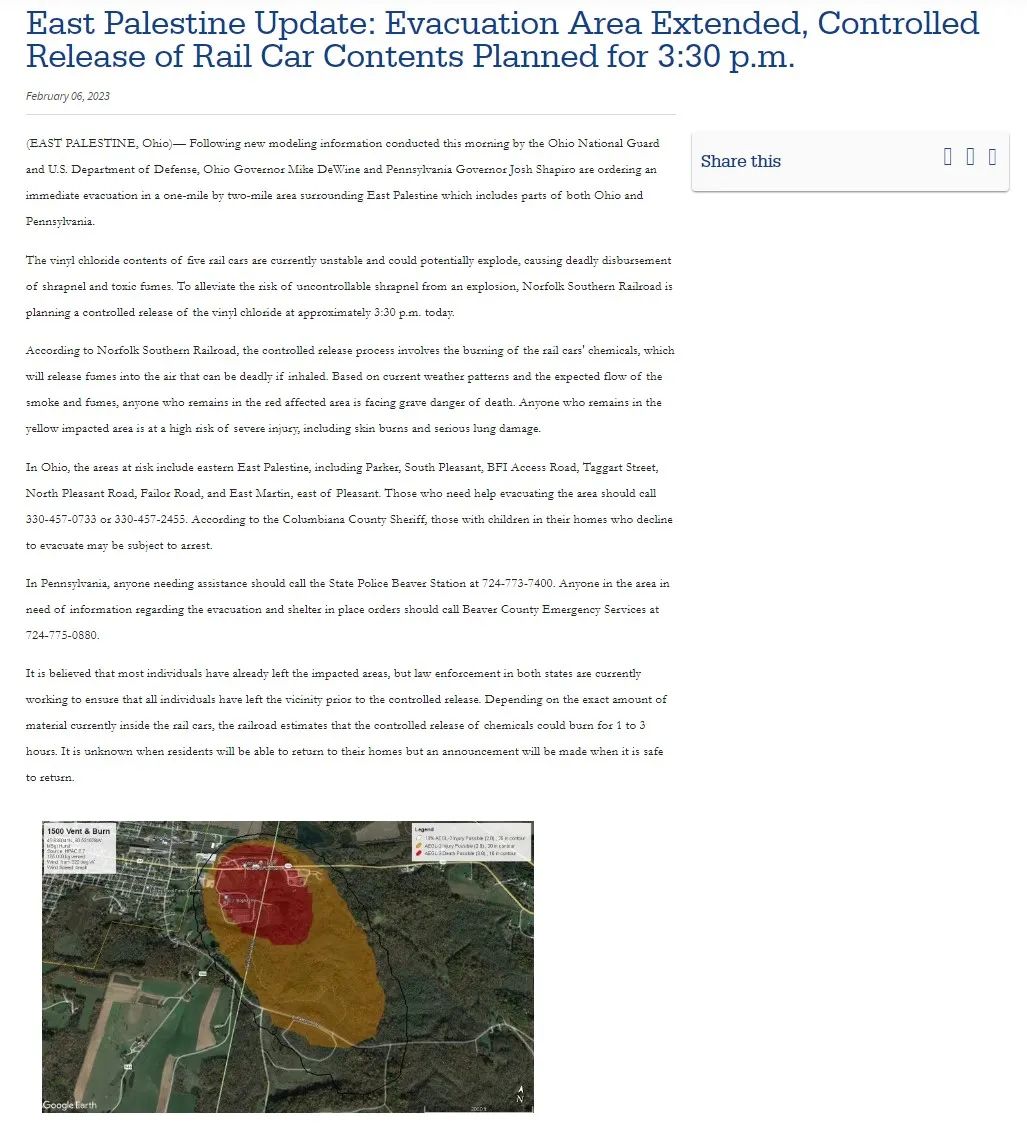 但两天后,即2月6日,俄亥俄州政府网站发布媒体公告称,在脱轨事发地周围1英里乘2英里区域内的居民都要进行疏散,理由是脱轨列车上有5节车厢装载的氯乙烯状态仍不稳定,可能发生爆炸。公告提到,诺福克南部铁路公司计划在2月6日下午3时30分左右,对车厢内的氯乙烯进行“控制释放”,该过程涉及化学品的燃烧,将产生致命烟雾。