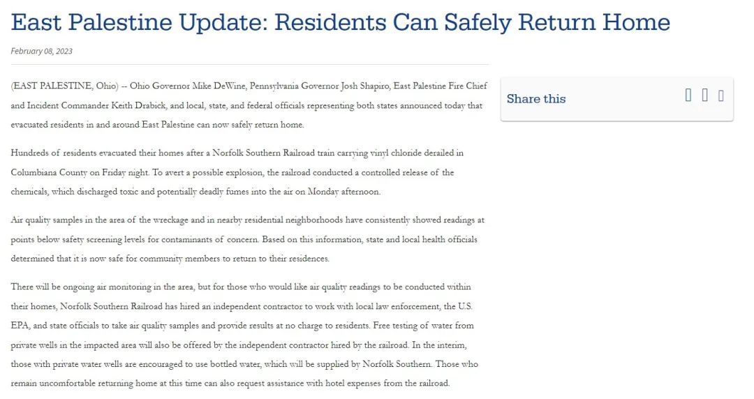 就在“控制释放”行动执行后的隔日,即2月8日,俄亥俄州政府再发公告称,列车脱轨区域附近居民区的空气质量样本读数显示已低于有关污染物的安全筛选水平,被疏散的居民已经可以安全回到家中。